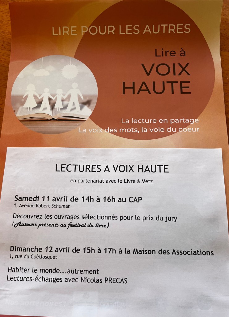 - Samedi 11 avril de 14h à 16h : Lecture au CAP, 1 avenue Robert Schuman